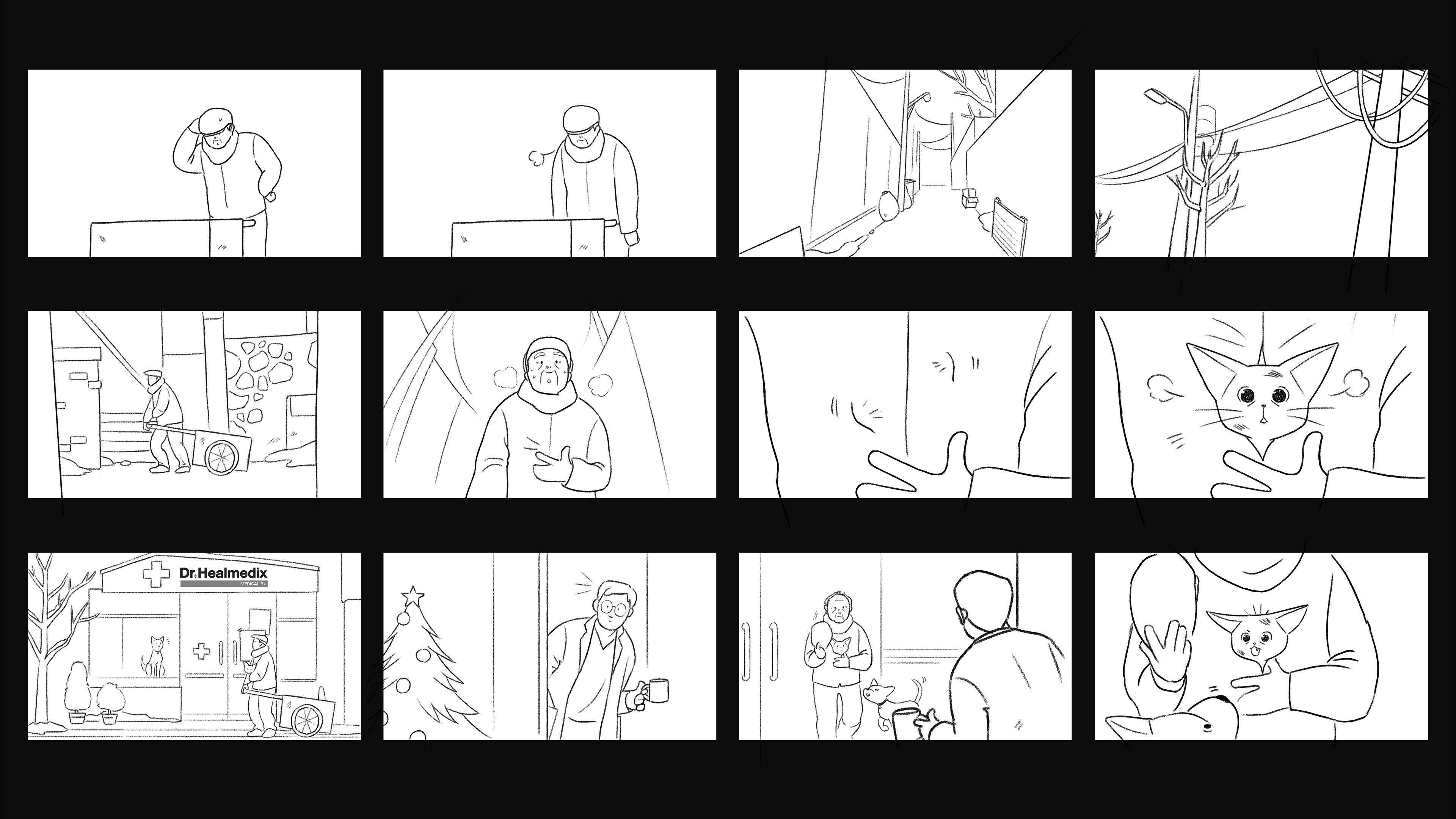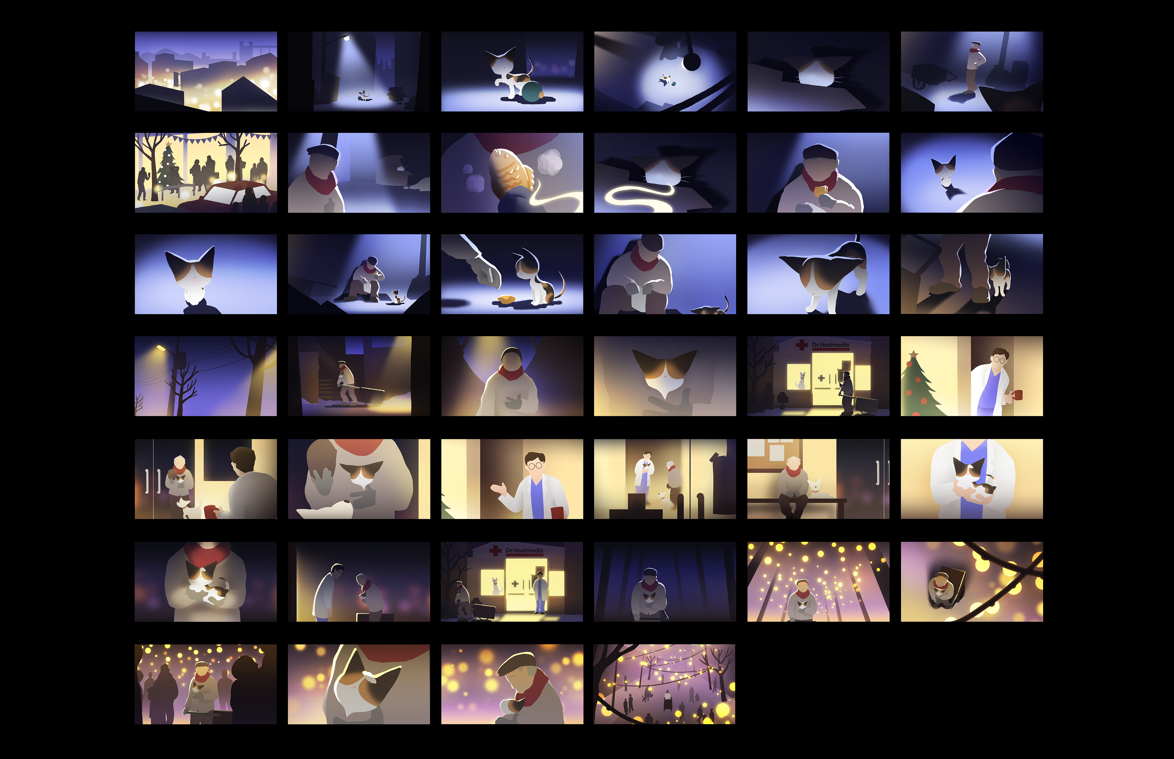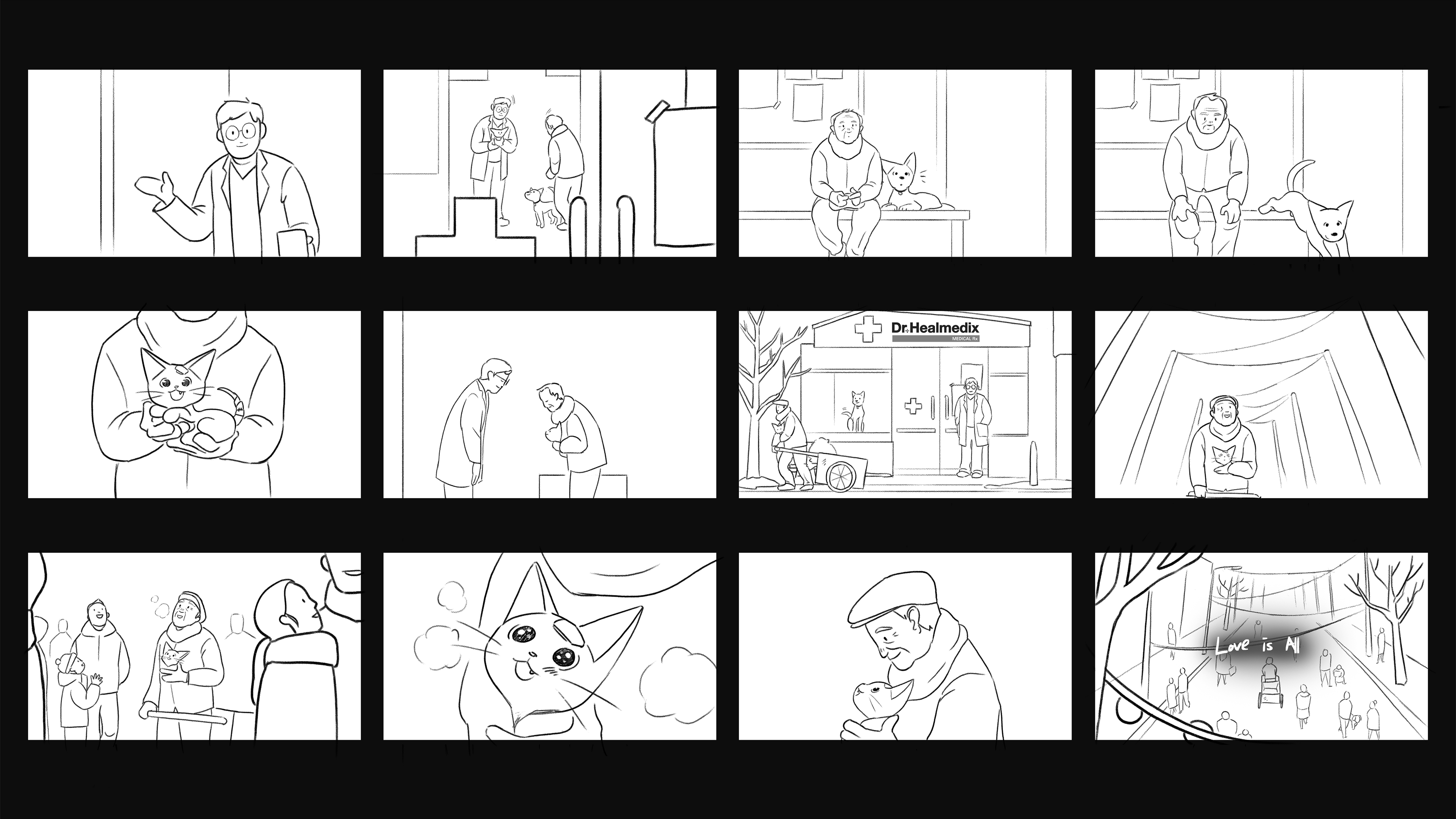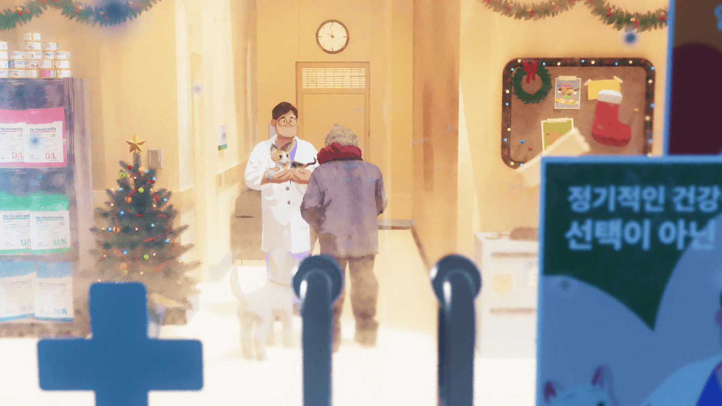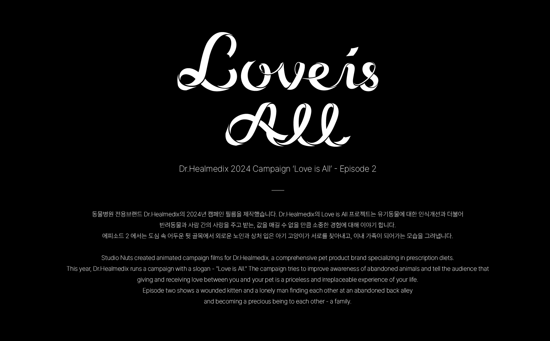 동물병원 전용브랜드 Dr.Healmedix의 2024년 캠페인 필름을 제작했습니다. Dr.Healmedix의 Love is All 프로젝트는 유기동물에 대한 인식개선과 더불어 반려동물과 사람 간의 사랑을 주고 받는, 값을 매길 수 없을 만큼 소중한 경험에 대해 이야기 합니다. 에피소드 2 에서는 도심 속 어두운 뒷 골목에서 외로운 노인과 상처입은 아기 고양이가 서로를 찾아내고, 이내 가족이 되어가는 모습을 그려냅니다. - Studio Nuts created animated campaign films for Dr.Healmedix, a comprehensive pet product brand specializing in prescription diets. This year, Dr.Healmedix runs a campaign with a slogan - "Love is All." The campaign tries to improve awareness of abandoned animals and tell the audience that giving and receiving love between you and your pet is a priceless and irreplaceable experience of your life. Episode two shows a wounded kitten and a lonely man finding each other at an abandoned back alley and becoming a precious being to each other - a family.